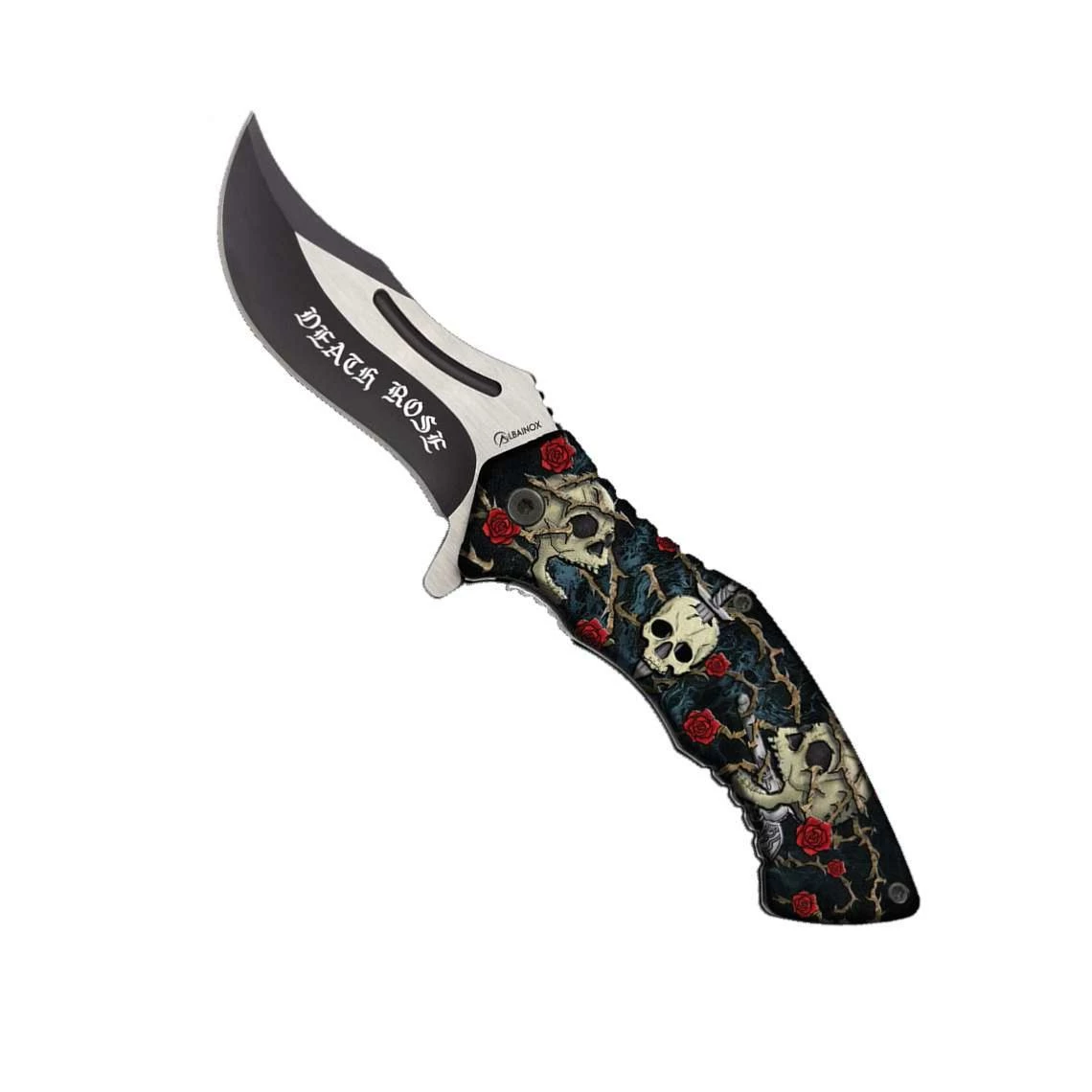 Couteau Albainox 18817 SKULL-ROSES, lame en acier inox 3Cr13Mov finition noire longueur 8.5 cm, manche en ABS avec décor 3D. Système de verrouillage liner look.