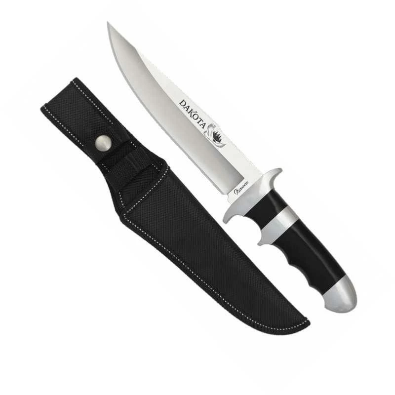 Couteau Albainox DAKOTA 32632, lame acier inox finition brillante. Manche en aluminium et polymère. Garde et pommeau en aluminium. Etui nylon noir avec passe ceinture.
