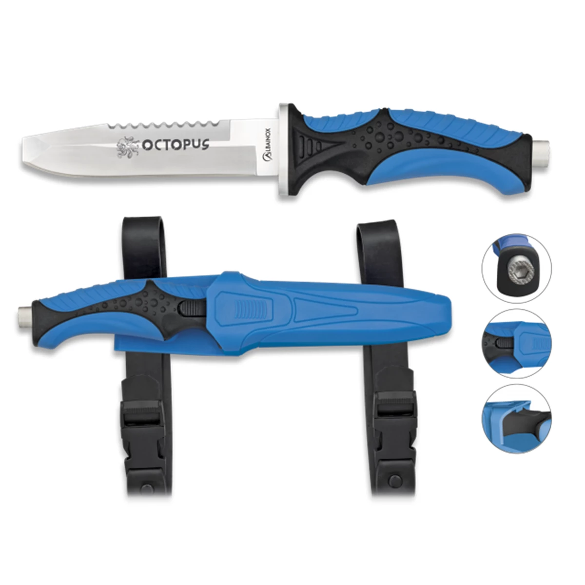 Couteau de plongée sous-marine OCTOPUS 32332 bleu et noir, lame acier inoxydable longueur 11.5 cm et manche en ABS et caoutchouc.