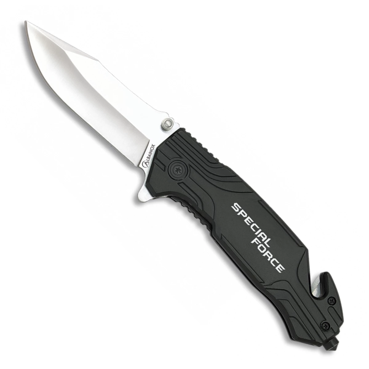 Couteau de sécurité ALBAINOX 19607GR184, lame inox longueur 9.2 cm, manche en aluminium noir avec brise vitre et coupe sangle.