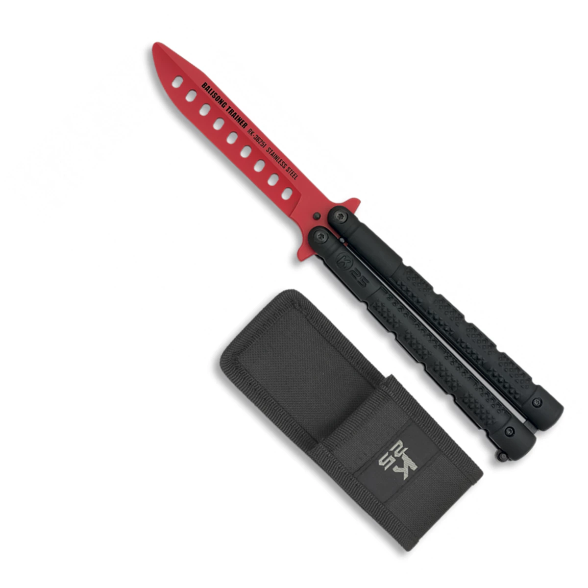Débutant en art martial ? Choisissez ce couteau papillon d’entrainement K25, livré avec son étui en nylon. Muni d’une lame non aiguisée en inox revêtement rouge et d’un manche en aluminium finition noir, portant le logo de la célèbre marque espagnole, le balisong permettra de parfaire votre maîtrise avec un objet plaisant et en supprimant le risque de se couper.