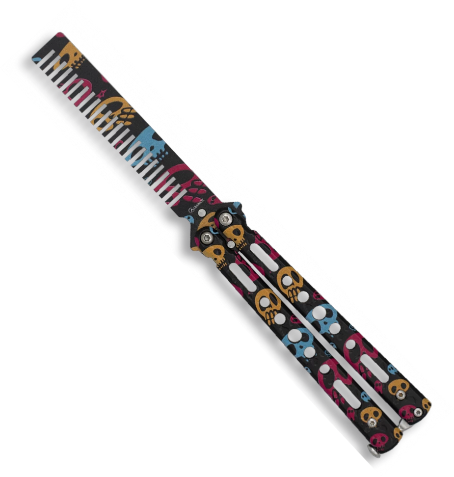 Couteau papillon d’entrainement Albainox 02209, lame peigne en acier 3Cr13Mov longueur 9.2 cm. Manche en acier. L’ensemble du couteau avec motifs tête de mort en 3D.
