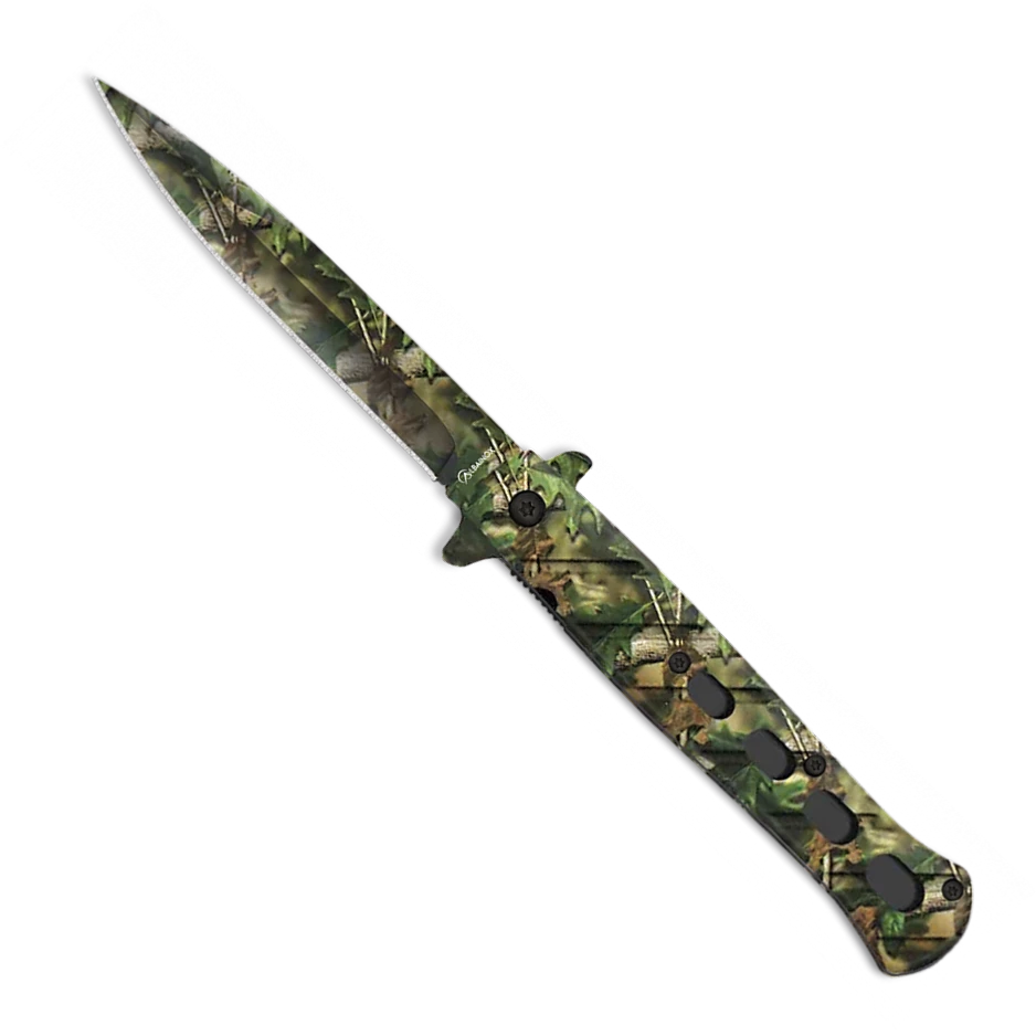 Couteau pliant à ouverture assistée Albainox 18600-A : lame pointe de lance en acier inox 3Cr13Mov longueur 10.5 cm et manche en ABS. L’ensemble du couteau dispose d’une finition camo boisé et est équipé d’un clip de ceinture et du système de verrouillage de la lame liner lock.