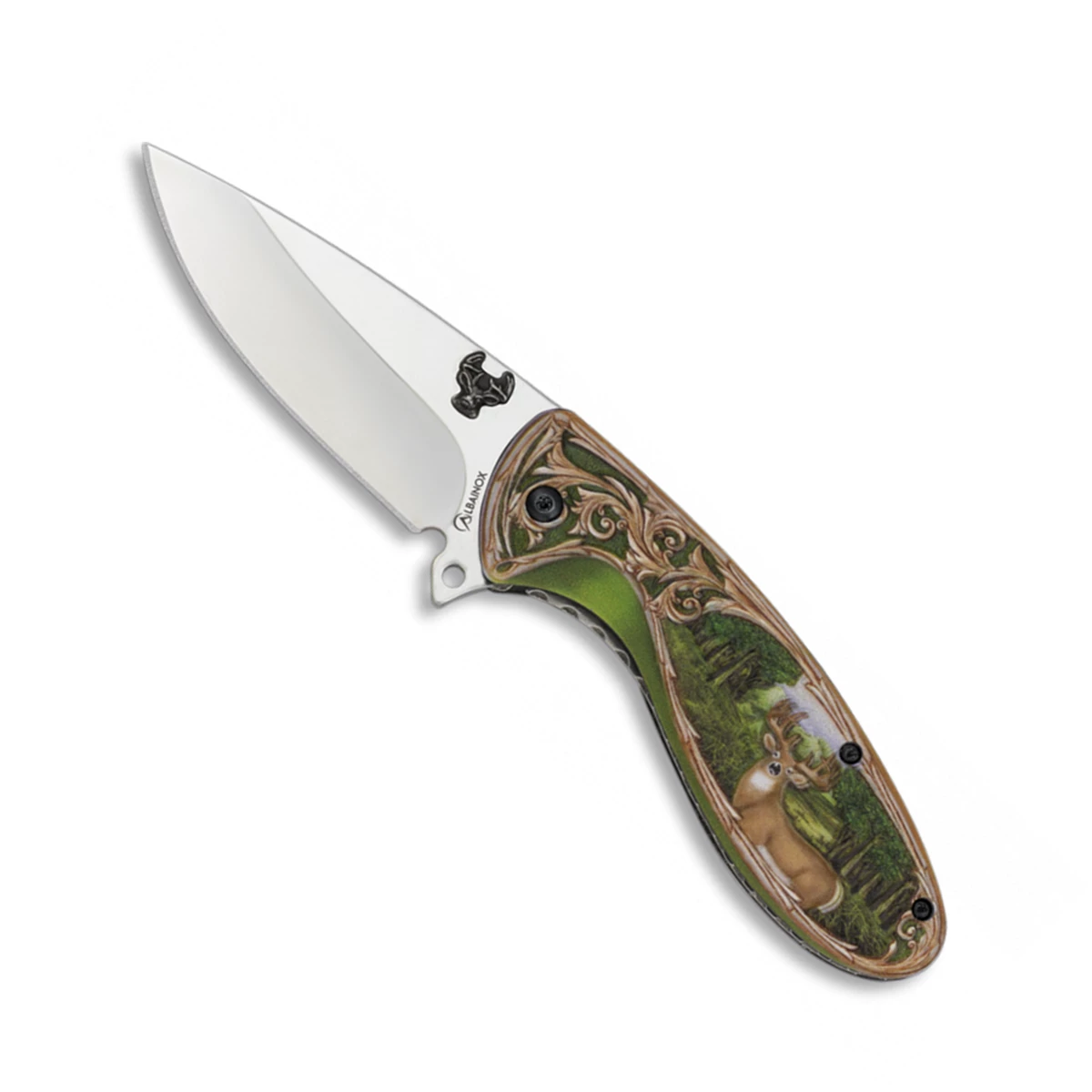 Couteau pliant avec décor paysage-cerf en 3D double relief sur le manche en aluminium et lame en acier inox longueur 8 cm.