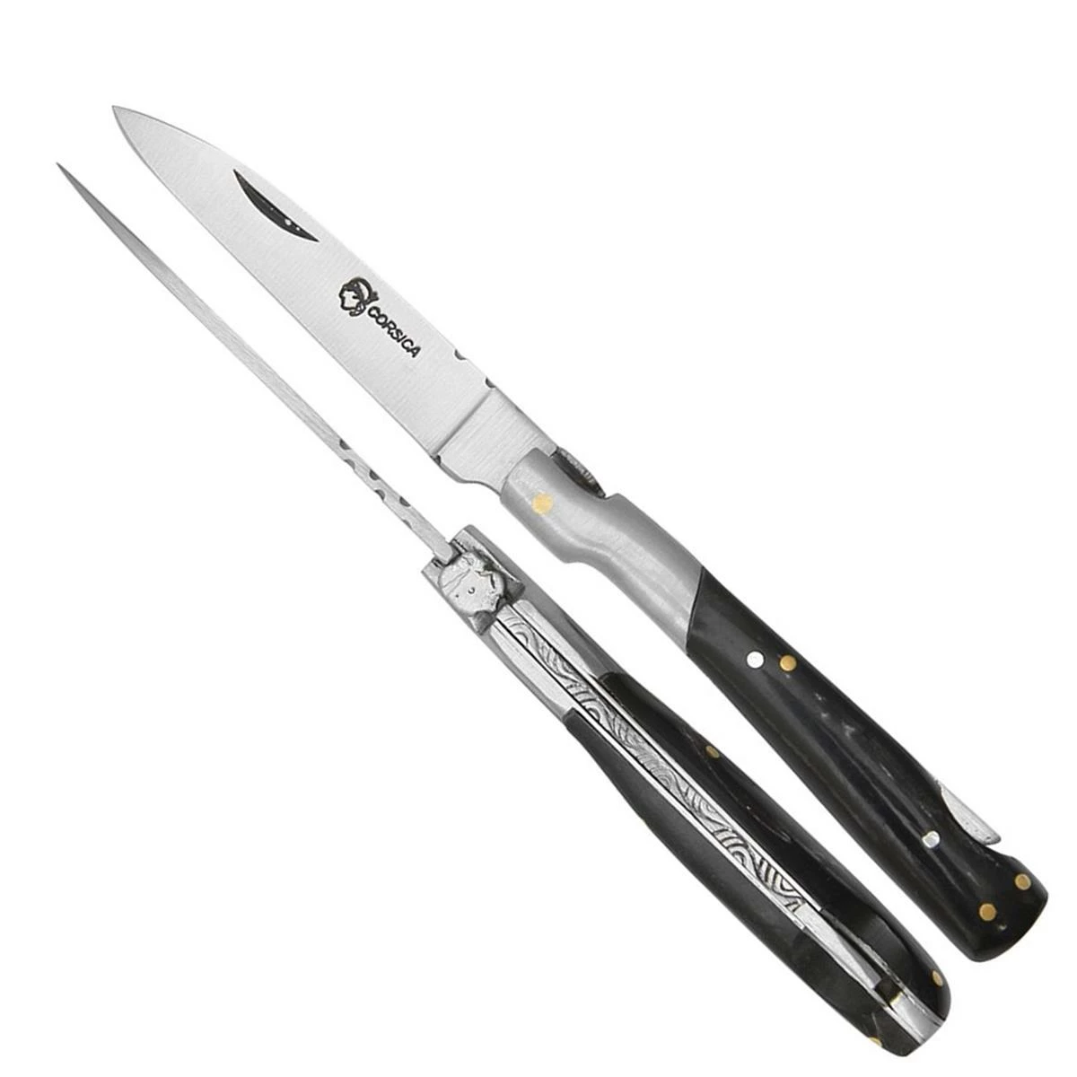 Couteau pliant van Corsica 30112, lame acier inox longueur 8 cm et manche avec plaquettes en Corne, virole acier inox.