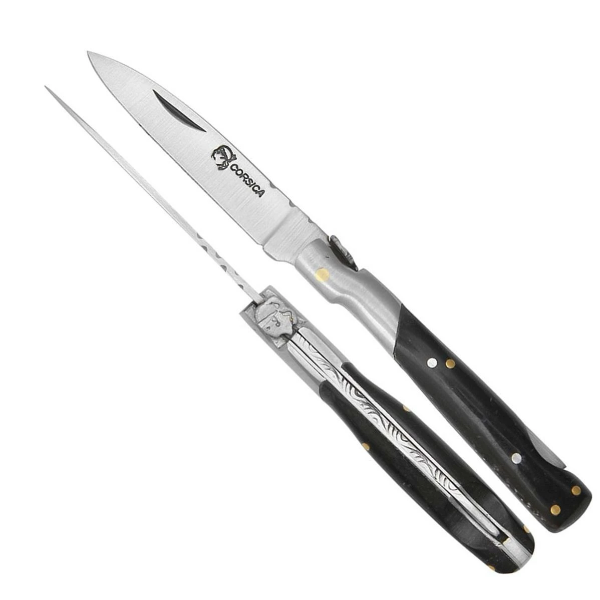 Couteau pliant van Corsica 30122, lame acier inox longueur 9 cm et manche avec plaquettes en corne, virole acier inox.