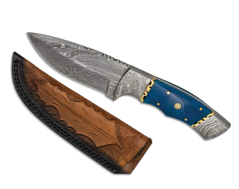 Couteau sportif Albainox 32567 : lame damas 256 couches longueur 10.6 cm et manche en os bleu.